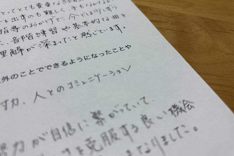 弓の持ち方や楽器の構え方を以前より気にかけられるようなったり(本人が)音符の長さのとらえ方等、自然に身に付くように導いてくださり、感謝しています。